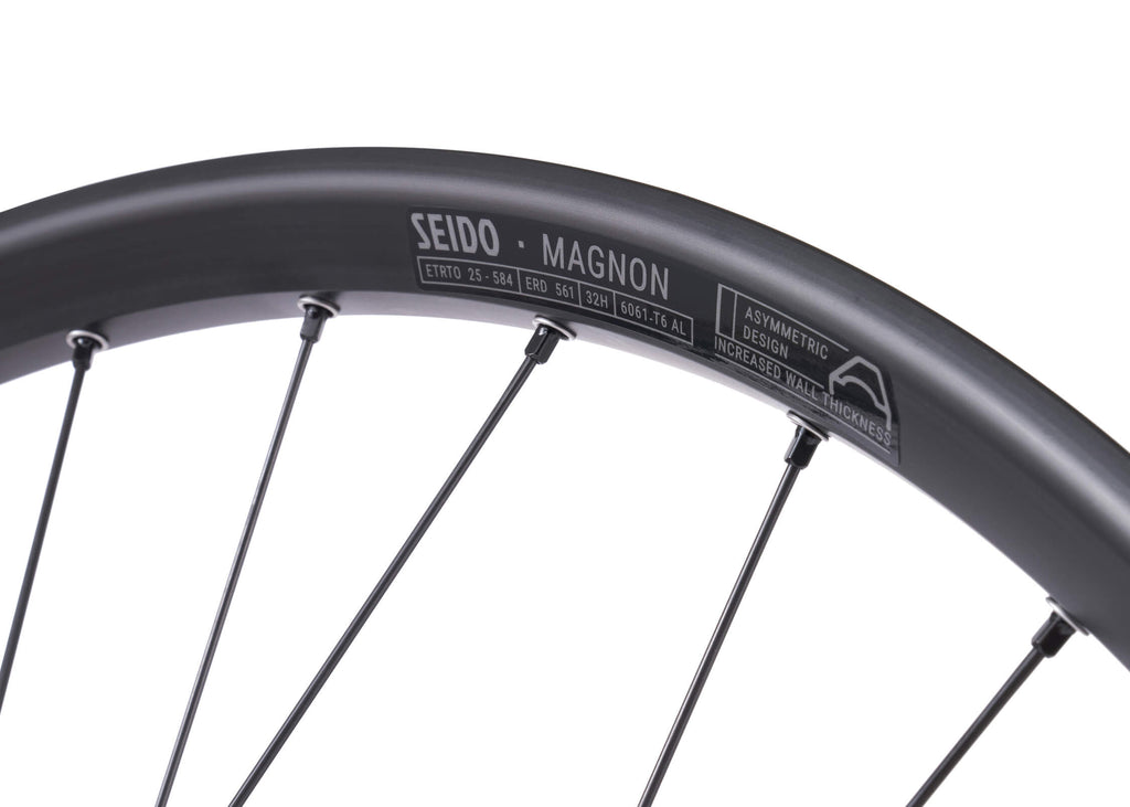 25 mm int. width 6061-T6 aluminum, asymmetric rim design, tubeless ready, single eyelets, increased wall thickness, sleeved joint, hooked clincher